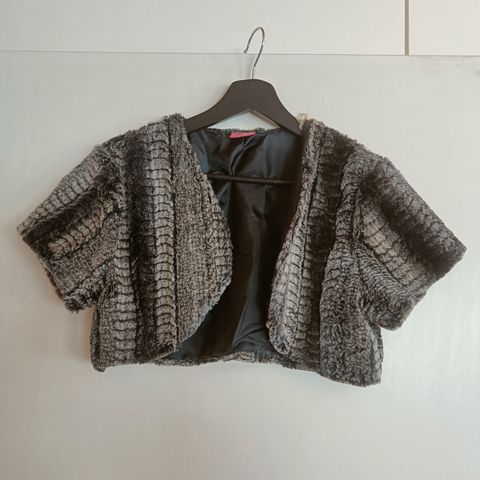 Kappahlin valkoinen karvabolero kokomerkintä 122/128, reiluhko. Kainalo-kainalomitta n.38cm. Yksi piilonappi edessä.