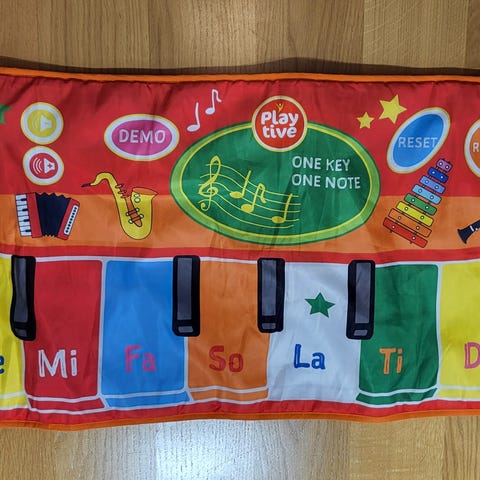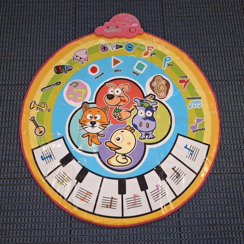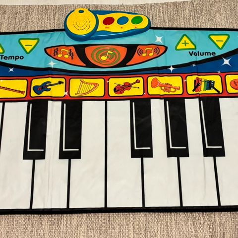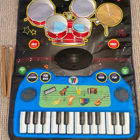 Myydään musiikkimatto. Eri soittimista painamalla kuuluu ääniä. Sisältää viisi kappaletta. Pussissa mikrofonit, jotka on käyttämättömät. Maton koko 120x90cm.
