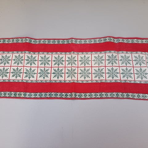 Jouluteemainen kangasliina, jossa on joulukuvioita kuten kuusen oksia ja marjoja. Värit ovat pääasiassa valkoinen, musta ja punainen. Kangasliina soveltuu esimerkiksi joulupöydän kattaukseen tai koristeeksi. Koko 40 x 73 cm. Hinta 5 euroa. Voin lähettää. mmm.
