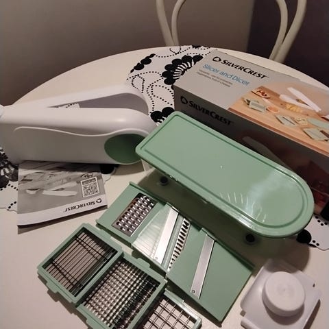 Myytävänä uudenveroinen, pakkauksessa jäljellä vain yksi laite oheistarvikkeineen ( ollut kaksi samanlaista settiä). Toinen otettu käyttöön, tämä siis jäljellä. Tällä silppuat / kuutioit / viipaloit niin kurkut ym. salaatteihin jne kätevästi vain yhdellä kädellä. Aito Nicer dicer tuote. Nouto, postitus/ toimitus jollain aikataululla esim. Myllyn nurkille.