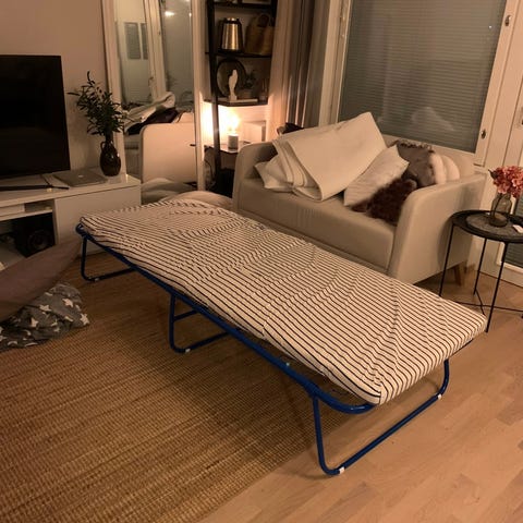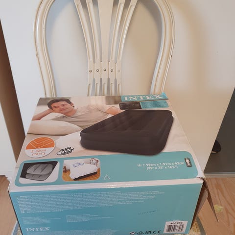 Ilmatäytteinen Intexin varavuode. Leveys 100cm. Täyttyy ja tyhjenee kätevästi laittamalla töpselin seinään. Mukana säilytyspussi. Nouto