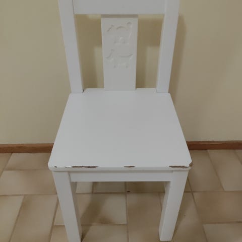 Pöytälevyn pinnassa hieman käytön jälkiä, samoin tuolissa yhdessä kohdassa pikkuisen valkoista väriä (ks. viimeinen kuva). Yleisilme siisti. Tuolin selkänojassa sievät kissa- ja koirasomisteet molemmilla puolilla. Halutessasi mukaan piirrustusalusta (ks. kolmas kuva).