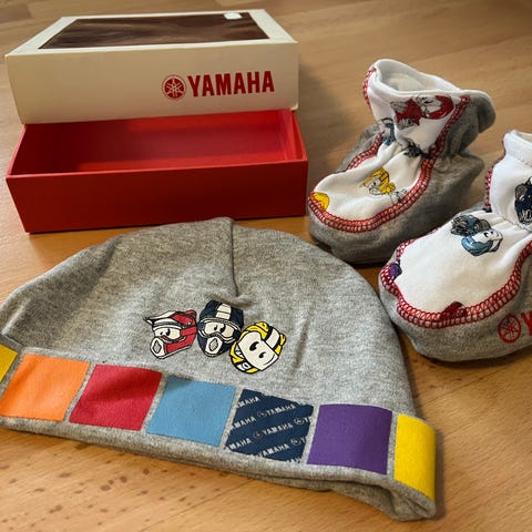 Uusi Yamaha-lahjapakkaus, jossa Yamaha-paita ja -housut 6-12 kuukauden ikäiselle.