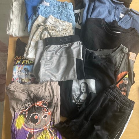 Annetaan vaatepaketti. Kunto keskimäärin kohtalainen, jokin vaate parempi, toinen kuluneempi. Sopii noin 160 cm pitkälle. Sisältää 2 hupparia, 2 farkkutakkia, 4 kauluspaita, kymmenkunta teepaitaa, yhdet mustat farkut.
