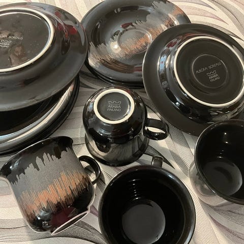 6 kpl settejä johon kuuluu kahvikuppi, tassi ja pullalautanen. Kaikki siistissä kunnossa, ei lohkeamia.