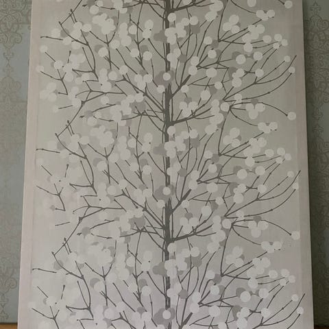 Marimekko-kangas, joka kiinnitetty 90,5 cm x 60,5 cm (paksuus 1,5 cm) kapalevyyn nuppineuloin. Kankaan voi irroittaa levystä ja käyttää toki muuhunkin tarkoitukseen.