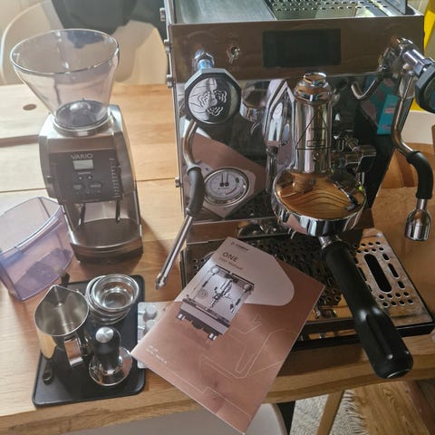 - sis pari kahvaa (7-15 g ja 21g nakukahva), tampperi,vaahdotusastia, painemittari ja puhdistusaine