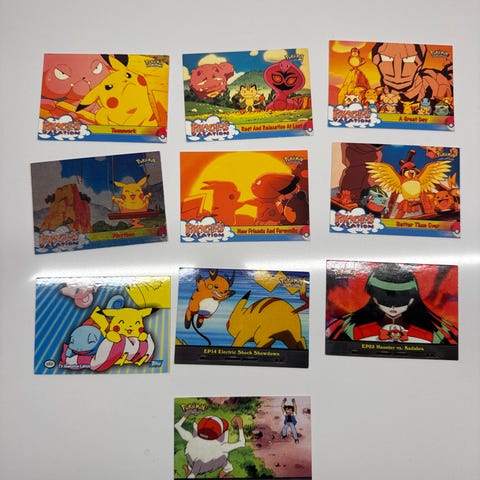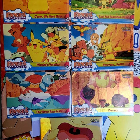 Kuvan setti. Huom ainoat avaamattomat pakkaukset ovat 1 kpl Pikachu pehmo tarrat ja kolme sandylion. Paketissa on