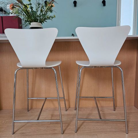 Myydään kuvanmukainen korkea kuppimallinen baarituoli. Tuoliosa valkoinen jalat tammen väristä puuta. Merkistä ei tietoa, pohjassa lukee Made in China. Tuoli on muuten hyvässä ja siistissä kunnossa, mutta istuinosan keinonahassa keltaista läikkää ja tämä osa muutenkin hieman kellastunut/värjääntynyt. Tuoli ollut käytössä kukkajakkarana ja ruukusta jäänyt painauma istuimeen, tämä ehkä ajan kuluessa nousee vielä muotoonsa.