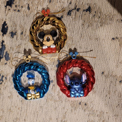 Uudet ja käyttämättömät lasiset Mikki Hiiri joulukuusenkoristeet. Ostettu Orlandon Disney Worldista aikoinaan. Koristeiden pituus 8cm ilman roikkumis kiinnike juttua.