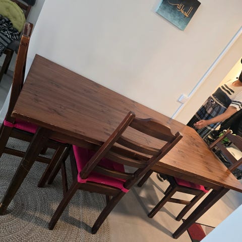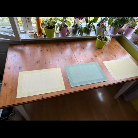 Kaunis ja tukeva jatkettava puinen ruokapöytä. Pöytä on hyväkuntoinen ja hyvin hoidettu, vain erittäin vähäisiä naarmuja tai käytön jälkiä (kuva).