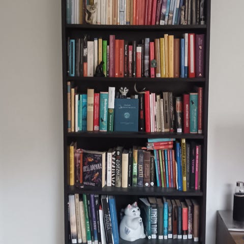 Tyylikäs tammenvärinen Billy-kirjahylly. Hylly on muutoin kuin uusi, mutta hyllyjen reunoissa on kirjoista jääneitä lieviä haalistumia (kuvassa 3).