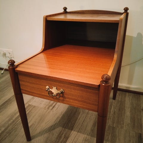 Somaksi ja siistiksi tuunattu mäntyinen yöpöytä. Laatikossa vähän somisteena tapettia ja marjapuuron /melkein pinkin värinen maali.