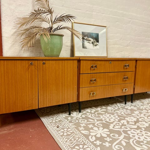 Kaunis vanha senkki, pitkä ja matala. Säilynyt hyvässä kunnossa ikäänsä nähden. Liukuovien takana avointa tilaa. Laatikot liukuvat hyvin ja ovat sisältä tosi siistit. Ylälaatikossa lukko.