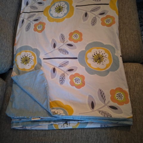 Aikuisten koko. Tyynyliina 57 x 45 cm. Sininen ruudullinen. 4 nappia, ettei peitto valu. Sivusaumat umpinaiset koko matkalta. Lämmin.