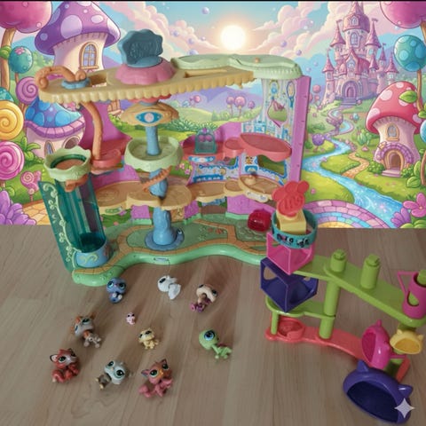 Littlest Pet Shop lasten leluasetelma, joka sisältää erilaisia pieniä eläinhahmoja ja leikkitarvikkeita. Setti soveltuu lasten leikkeihin ja sisältää useita värikkäitä osia. Myydään yhtenä settinä