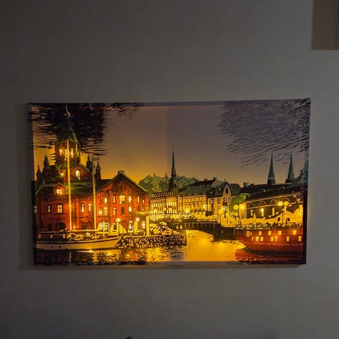 • Aito Kunto: LED-tekstit ovat kirkkaasti toiminnassa. Huomaa, että taustan pienistä koristevaloista osa on pimeänä, mikä on tyypillistä tämän tyyppisille vanhemmille tauluille, mutta ei haittaa pääefektiä.