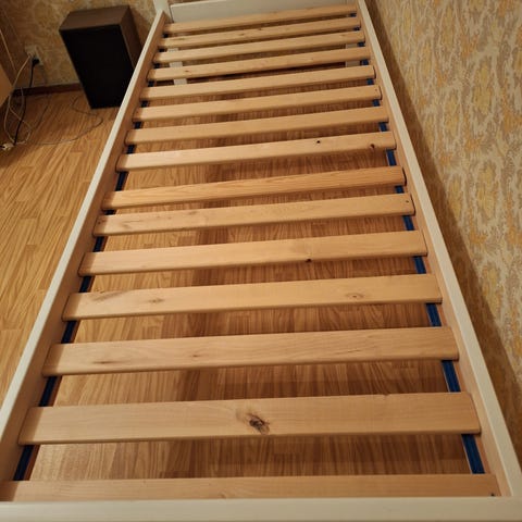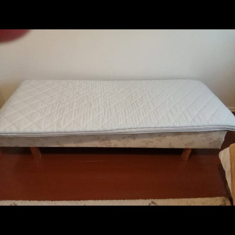 Sänky + joustinpatja. Patja 80cm, sängyn runko leveimmältä kohdalta noin 86cm.