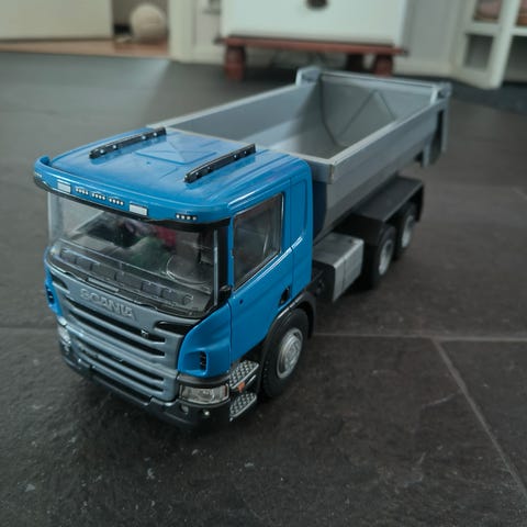 Kuvan kuorma-auto. Kärrystä puuttuu toiselta puolen osa joka ei vaikuta leikkimiseen.