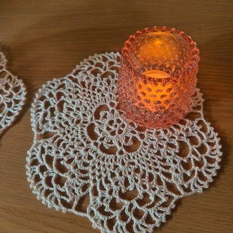 8 kpl Käsin virkattua pitsiliinasta valkoisesta langasta. Pyöreä muoto ja koristeellinen pitsikuviointi. Soveltuu pöytäkoristeeksi, lasinalusena käytettäväksi tai kattausliinaksi. Hopeinen virkattu reunus. Tehty tupakoimattomassa ja elämettömässä taloudessa. Hinta yhteensä. Maksu MobilePay.