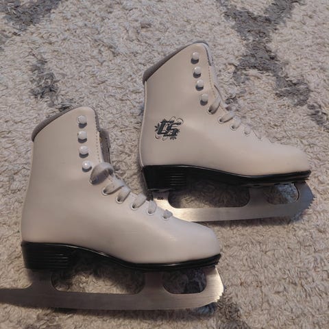 Hyvässä kunnossa olevat taitoluistimet kokoa 32. Pohjallisen mitta 21,5cm. Väri valkoinen/pinkki.