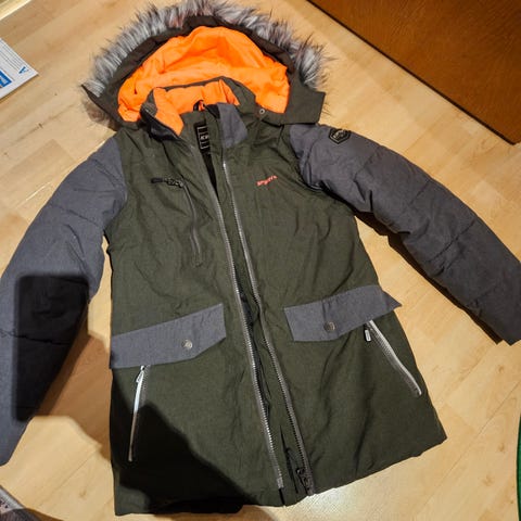 Kiinteä huppu, vetoketjutaskut edessä. Takissa on käytössä tullutta tummentumia helmassa ja hihoissa, on tavallisen pesun jäljiltä eli normipyykissä ei puhtaaksi lähtenyt. On ehjä.