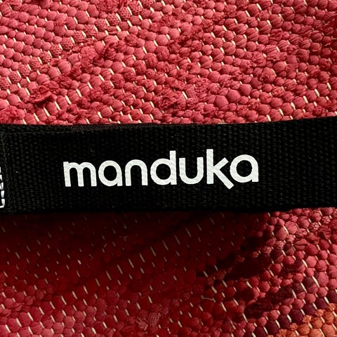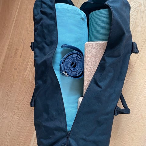 Siistissä kunnossa oleva joogamattokassi. Kaksi vetoketjullista taskua, säädettävä kantohihna. Merkki: Manduka