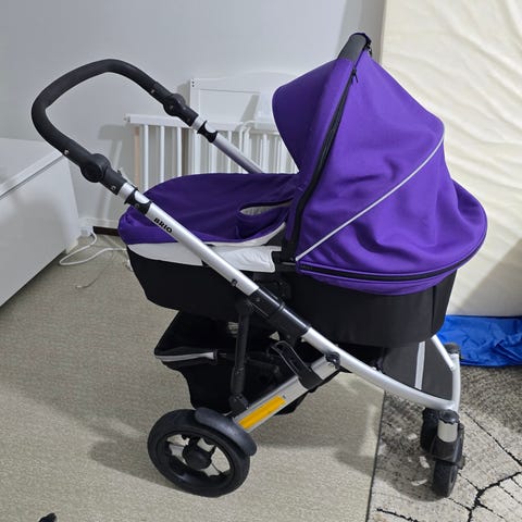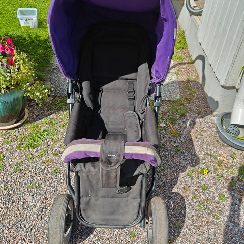 Brio lastenrattaat, joissa on pinkki kangas ja hopeanvärinen runko. Rattaat on suunniteltu lapsille, niissä on säädettävä työntöaisa ja erillinen kantokassi. Kankaat hyvänkuntoiset, mutta työntöaisassa on näkyvissä kulumaa. Rattaita käytetty vain sisällä.