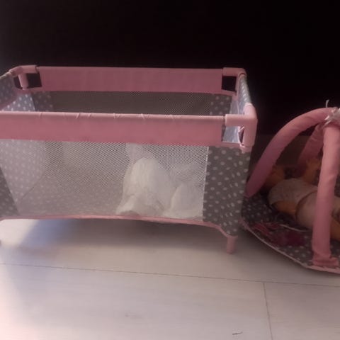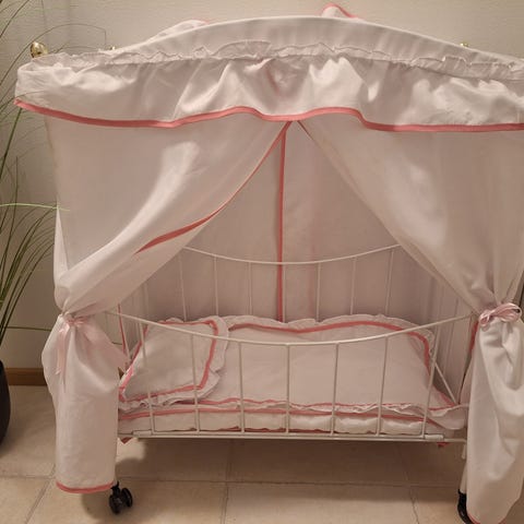 Lasten nukkesänky valmistettu puusta, väriltään valkoinen. Mukana punavalkoinen peitto ja tyyny, joissa dinosauruskuvio. Soveltuu lasten leluksi nukkien ja pehmolelujen leikkeihin.