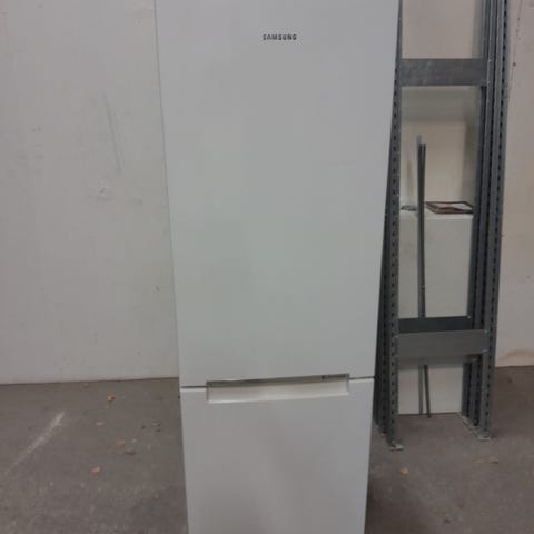 Samsung jääkaappipakastin valkoisella värillä. Jääkaappipakastin sisältää useita hyllyjä ja laatikoita säilytystarpeisiin. Laitteessa on digitaalinen lämpötilanäyttö, joka osoittaa jääkaapin ja pakastimen lämpötilat. Malli on REBC331MW.