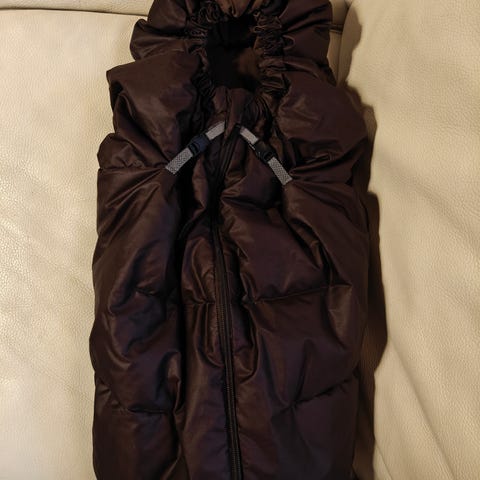 Vaaleanpunainen untuvapussi turvakaukaloon tai/ja vaunuihin Buddy and Hope merkiltä. Muutamista kohdista revennyt vöiden aukkojen kohdalta, mutta on korjattavissa ja muuten käytettävässä kunnossa. Ei pesty kertaakaan.