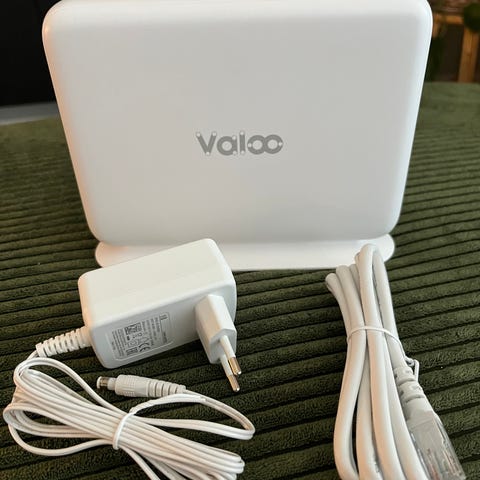 Valoo Wifi 6 Mesh reititin tarjoaa langattoman verkon hallinnan mesh-teknologian avulla. Laitteessa on valkoinen väritys ja mukana tulee virtalähde sekä tarvittavat kaapelit.