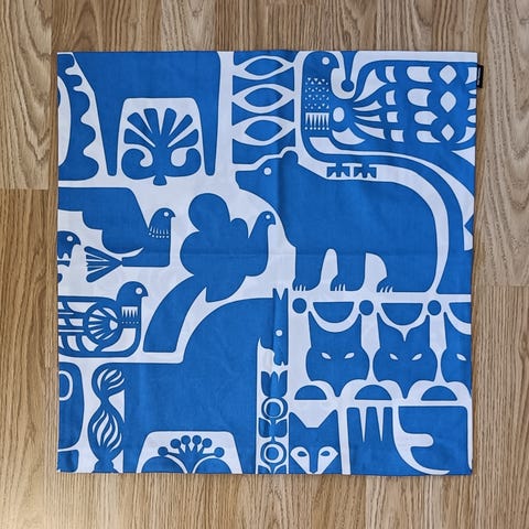 Marimekko Kanteleen kutsu kankaasta, ompelijalla teetetyt päälliset tyynyineen.
