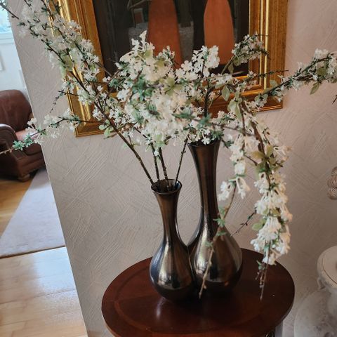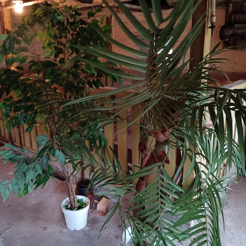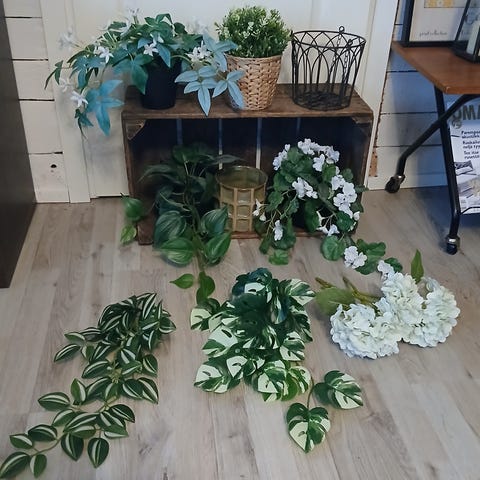 Vanhassa saviruukussa kiinteästi oleva tekokasvi. Kokonaiskorkeus 130cm.