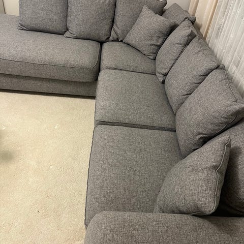 Sohvassa on irrotettavat selkätyynyt ja klassinen muotoilu, joka sopii erilaisiin sisustustyyleihin. Kulma edestä katsottuna vasemmalla puolella. Kulmaosa irrotettavissa kuljetusta varten.