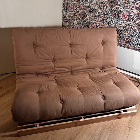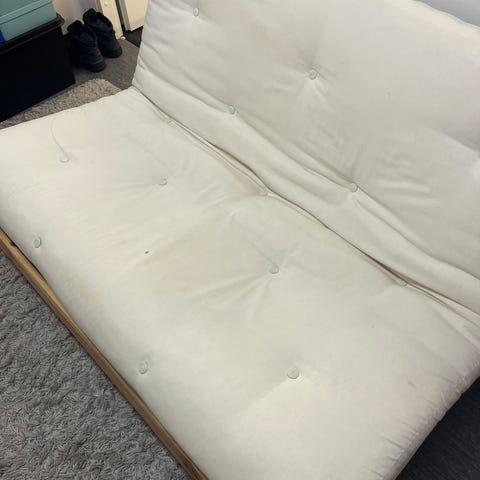 Patja on tahriintunut ja ollut koirataloudessa. Patja kaipaa pesua teksiitilipesurilla tai uutta päällistä. Alkuperäinen päällinen ei ole irrotettava ja sen vuoksi haastava pestä