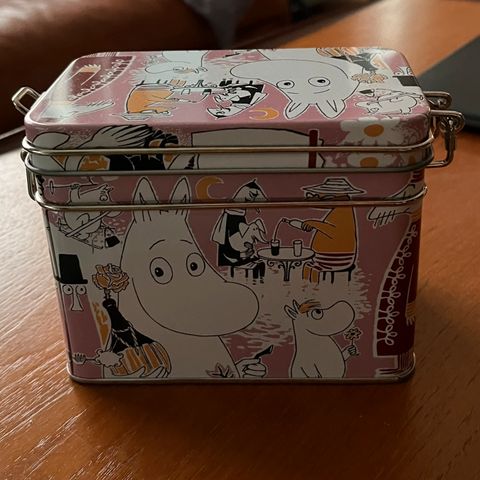 Moomin by Martinex Muumi peltipurkki. Korkeus n. 16 cm, leveys n. 15,5 cm ja syvyys n. 6,5 cm. Vähänkäytetty. Vähäisiä käytön jälkiä. Nouto tai postitus. Postikulut ostajalle.