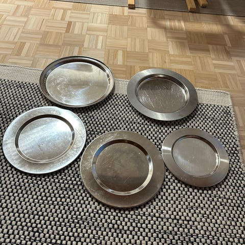 Tarjoiluvati Painometalli 40,5 x 32,5 x 3,0 ruostumatonta terästä. Pieniä käyttönaarmuja pelleissa on. Toisessa pieni painautuma. Ks. valokuva
