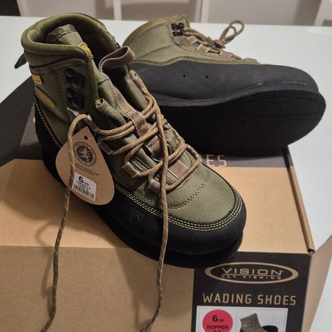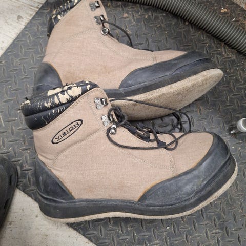 Nastapohjaiset Vissun kahluukengät. Vasemman kengän pintasauma hieman repsottaa, saa liimalla uudenveroiseksi. Laadukkaat kengät. Sopii hyvin liukkaille kivikoille niin koskessa kuin merenrannalla. Koko 46.