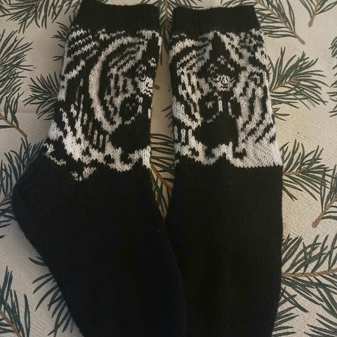 Muumi-aiheiset tummansini-valkoiset pitkävartiset villasukat (75 % villaa), koko 36-37. Jalkaterän pituus 23,5 cm, varren pituus 27,5 cm.