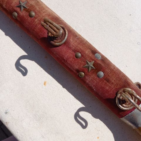 Miehekäs lehmänsarvista tehty naulakko. Rautakoukut ottaneet vähän ruostetta pintaan, keskiosa sametti