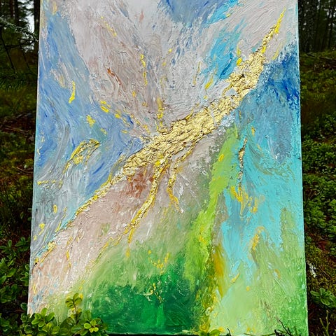 Abstrakti taulu, jossa on pastellisävyjä kuten vaaleanpunaista, vihreää ja valkoista. Maalaus on tehty paksulla tekstuurilla.