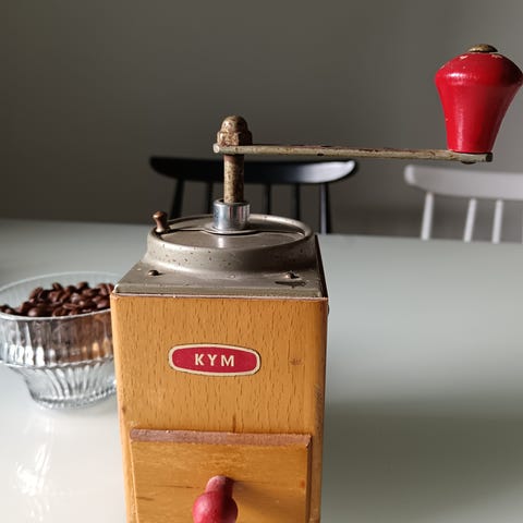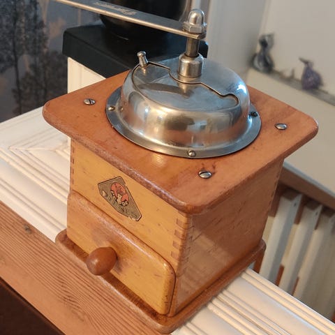 Kahvifriikin manuaalinen kahvimylly. TWERGin designia (MC0181) ja laadukas päärynäpuinen. Erittäin hyvä kunto. Ubaldo Piazzan 1930 suunnittelema malli.
