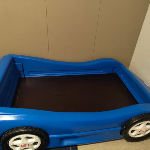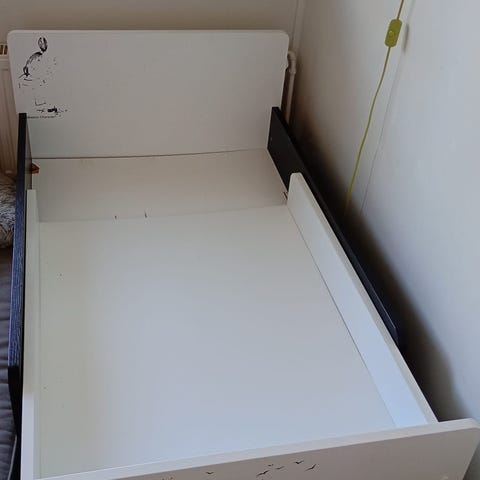 Tässä ollut muumi maalaukset, mutta nyt jo kuluneet. Pari tarraa. Sängyn alla myös laatikko.