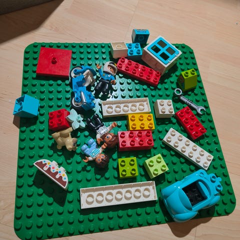 Joskus ehkä 2009 ostettu Lego Dublo aloituspakkaus, mukana myös mahdollisesti jotain muutakin. Peruspalikoita, auton pohja ×2