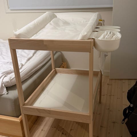 IKEA lastenhoitopöytä valkoinen, jossa on kaksi vetolaatikkoa ja korotettu reunus hoitoalustalle. Pöytä tarjoaa säilytystilaa ja tasaisen pinnan vaipanvaihtoon.