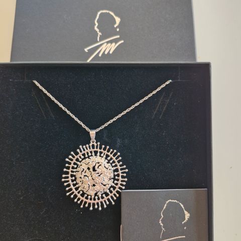 Käyttämätön ja omassa pakkauksessaan olevan kaulaketjun pituus 60 cm ja itse aurinko n 30 mm.