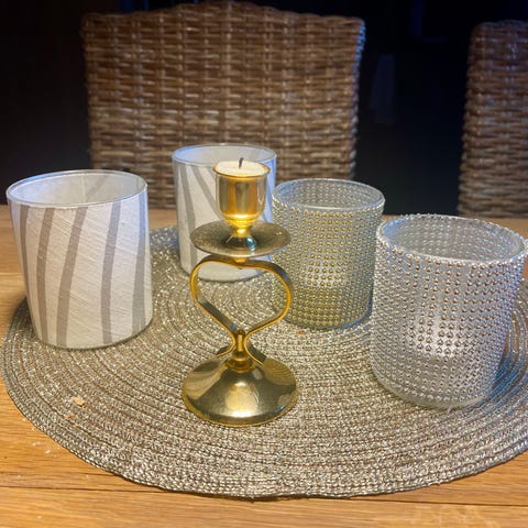 Paikat kolmelle kynttilälle, materiaali harjattua ruostumatonta terästä, korkeus 20.5 cm. Kaksi koukkua kadonnut, korvattu rautalangalla. Alkuperäisessä pakkauksessa.
