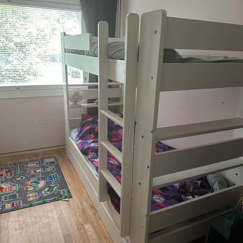 Valkoinen Unipuu kerrossänky 80x200. Kerrossängyn myös kahdeksi erilliseksi sängyksi. Pieniä kuluman merkkejä, mutta yleisilme siisti ja on yhä ehjä ja kestävä.
