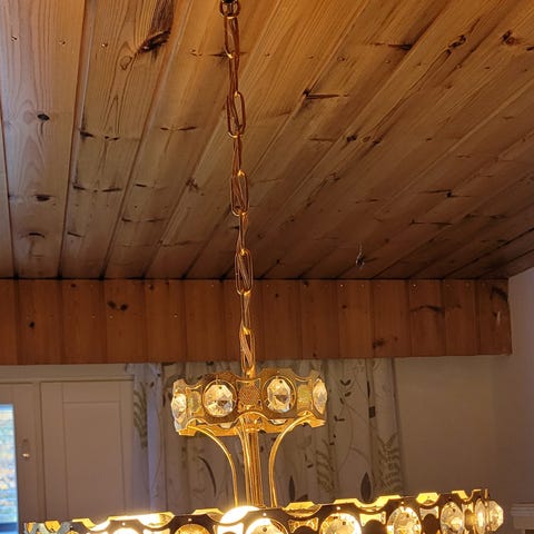 Messinkinen kristallikattokruunu, johdotus/kynttilät uusittu alkuperäiset kynttilät mukaan. Ei kristalleja.